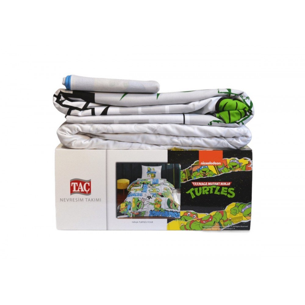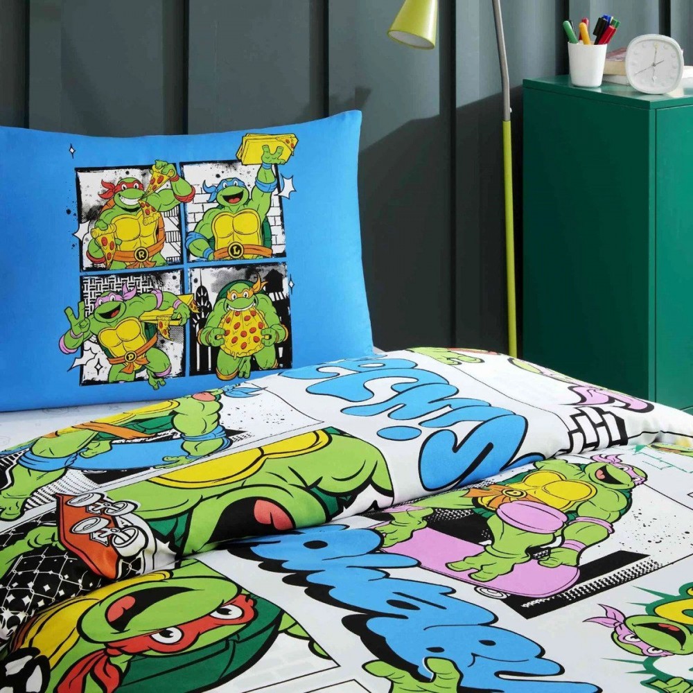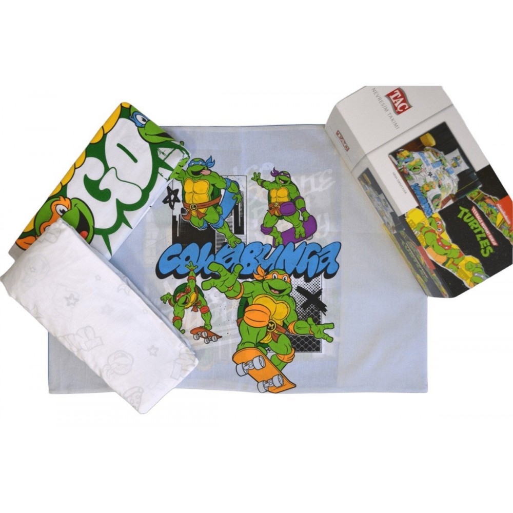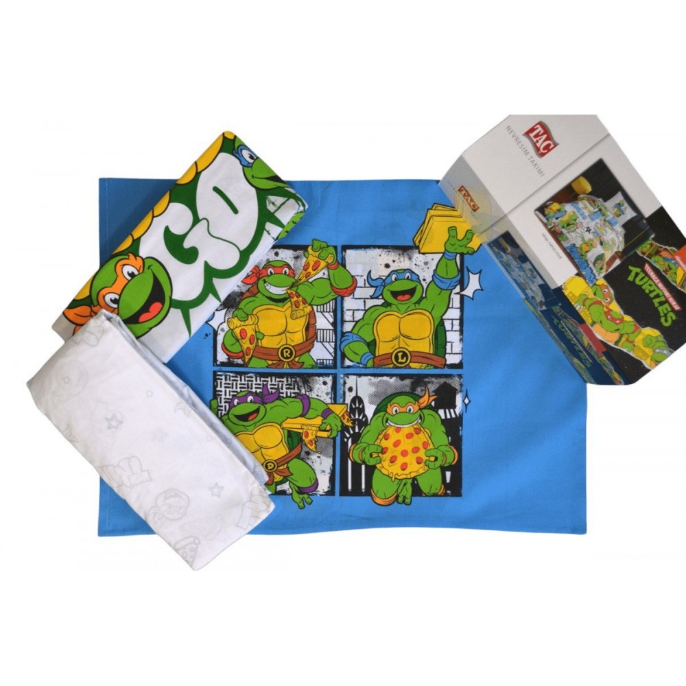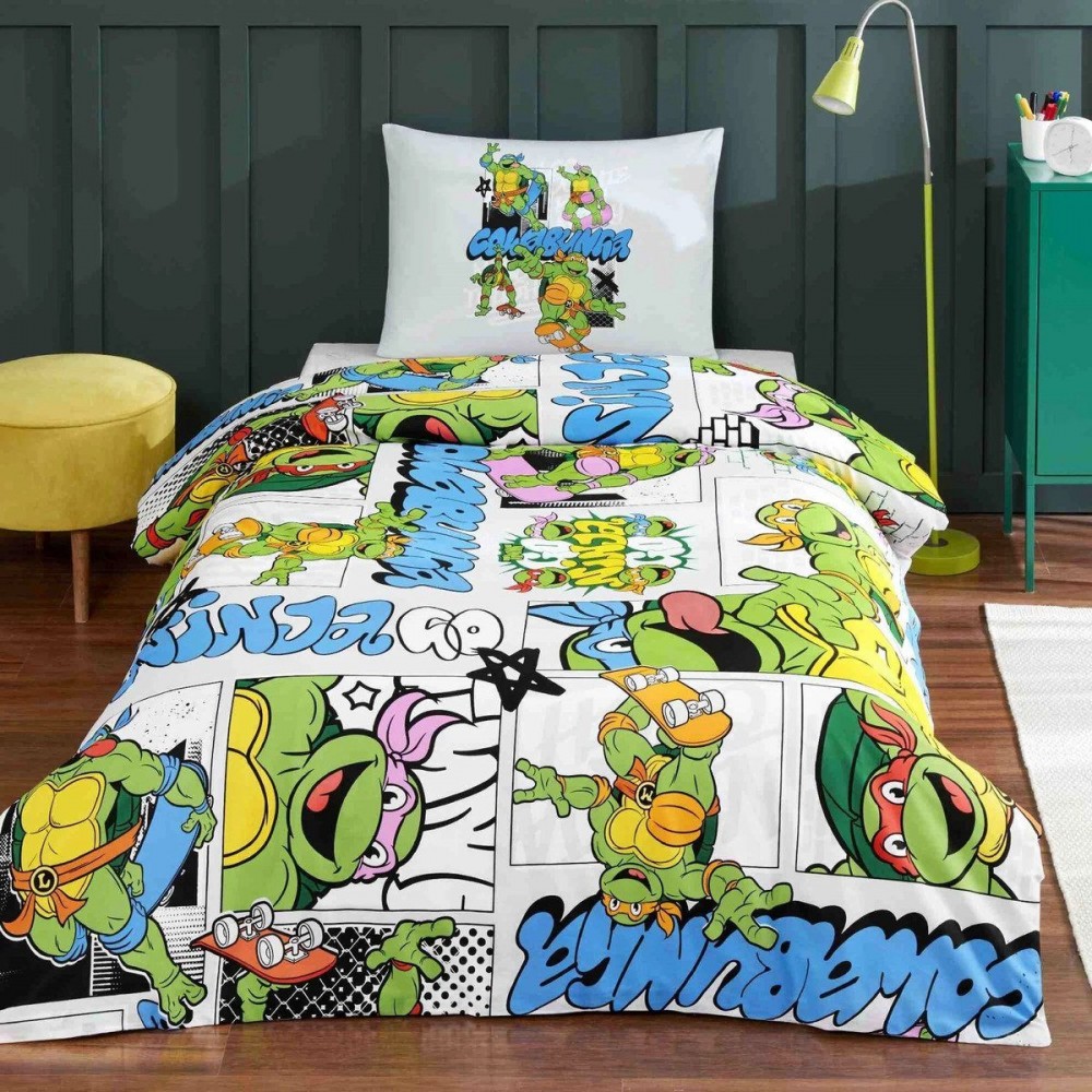 Потопете се в света на приключенията с детския спален комплект Ninja Turtles Four! Със своите свежи цветове - бяло, синьо и зелено - този комплект ще донесе на всяко момче динамика и енергия. Принтът на плика за завивка показва четиримата герои от Teenage Mutant Ninja Turtles - Леонардо, Рафаел, Микеланджело и Донатело, готови за нови приключения и битки срещу злото.