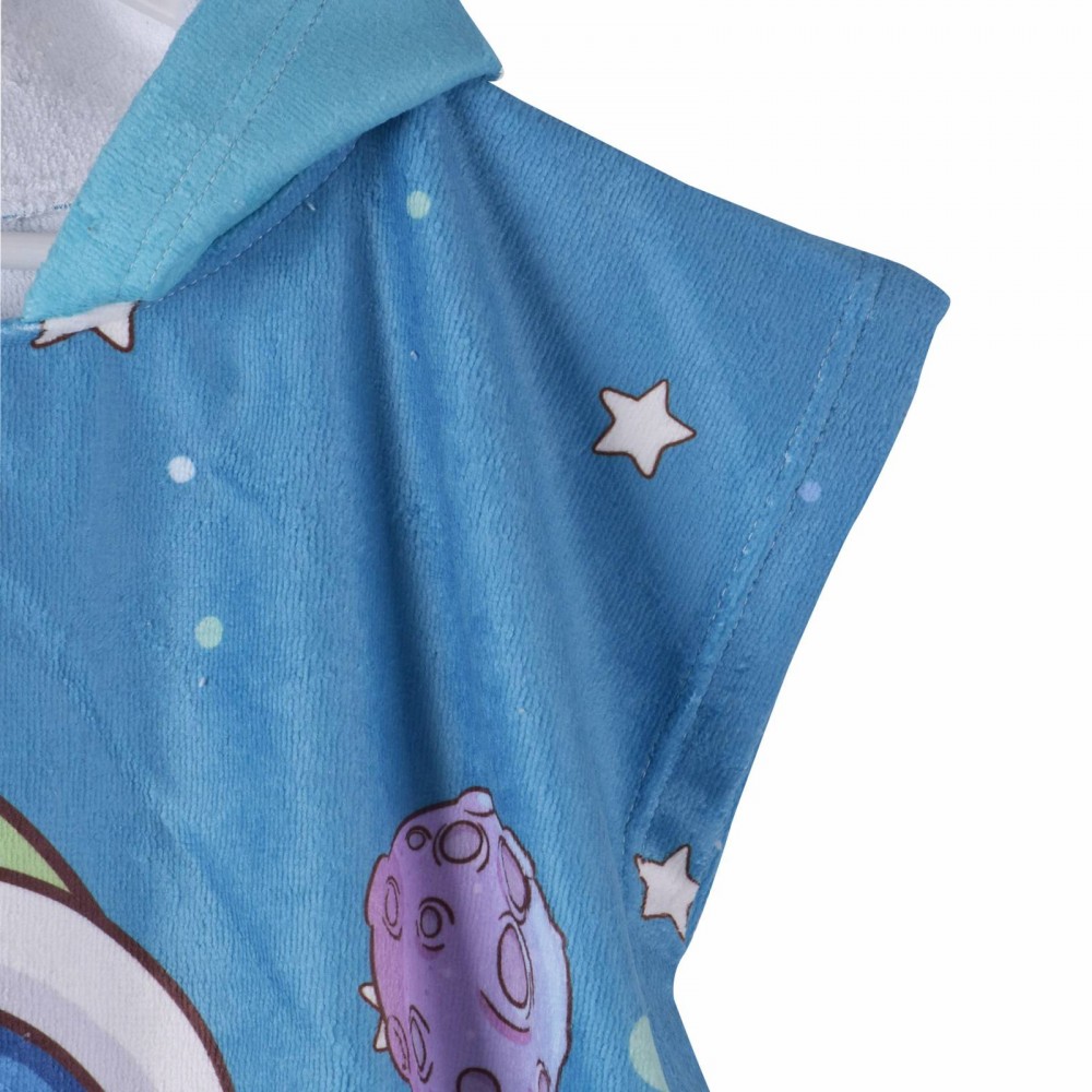 Детското пончо е изработено от екологични материи, които не предизвикват алергии. Меко и нежно на допир. С качулка. Моделът се предлага в красиви и ярки десени, които определено ще забавляват вашето дете. Подходящо за деца до 120 см.