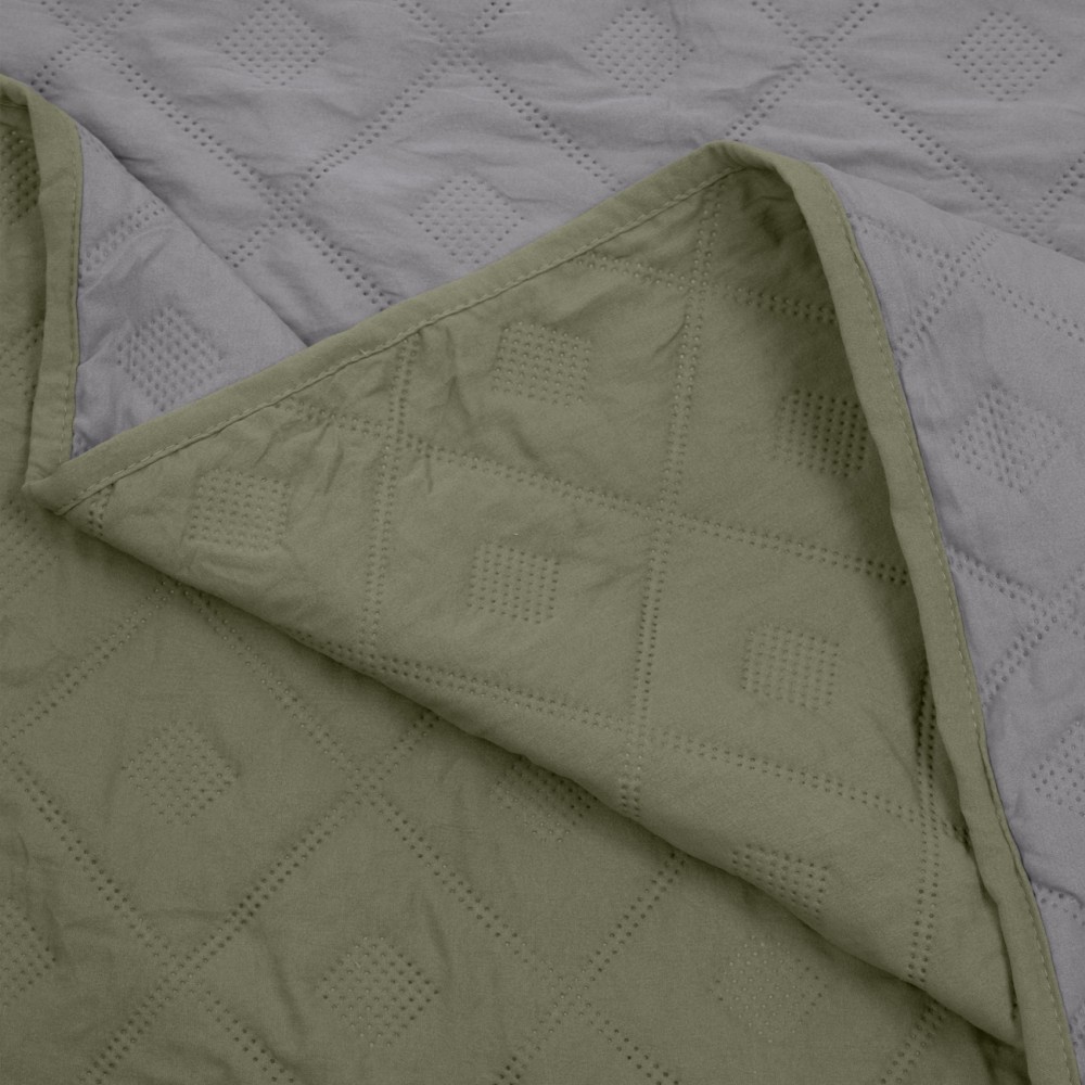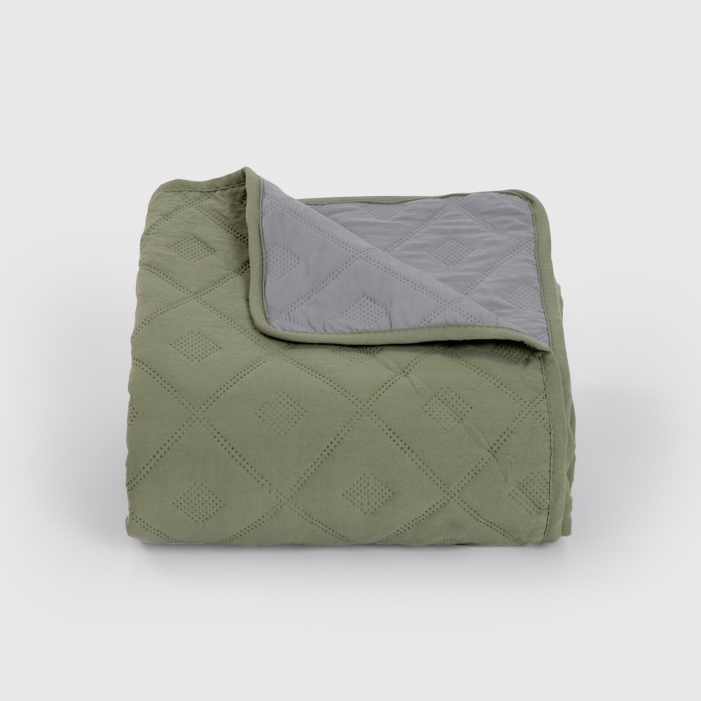 Двулицево шалте за спалня със семпъл дизайн и нежен геометричен капитонаж в зелено и сиво.
