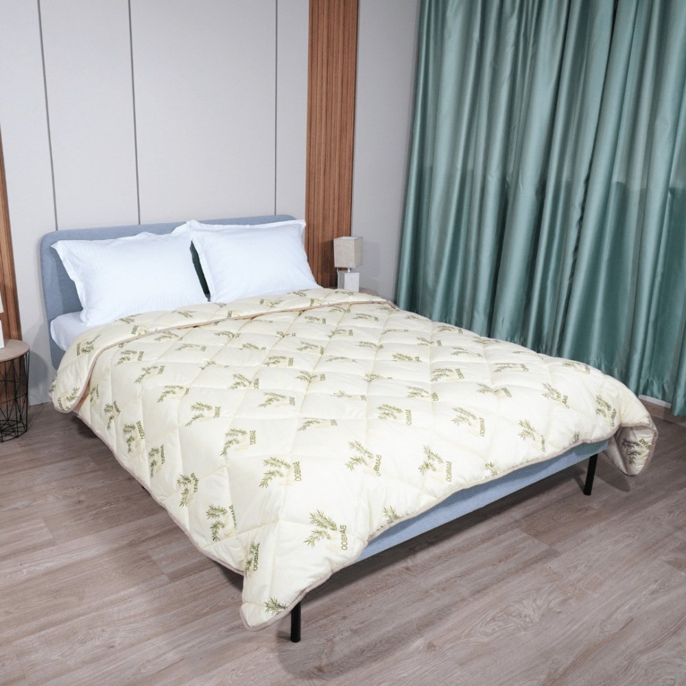 Лицевият плат от 100% микрофибър с бамбукови екстракти има изискан дизайн с бамбукови клонки на фон екрю, осигуряващ не само комфорт, но и елегантен вид. Пълнежът от 70% мериносова вълна и 30% полиестер предлага отлична терморегулация, като поддържа идеална температура през зимата.