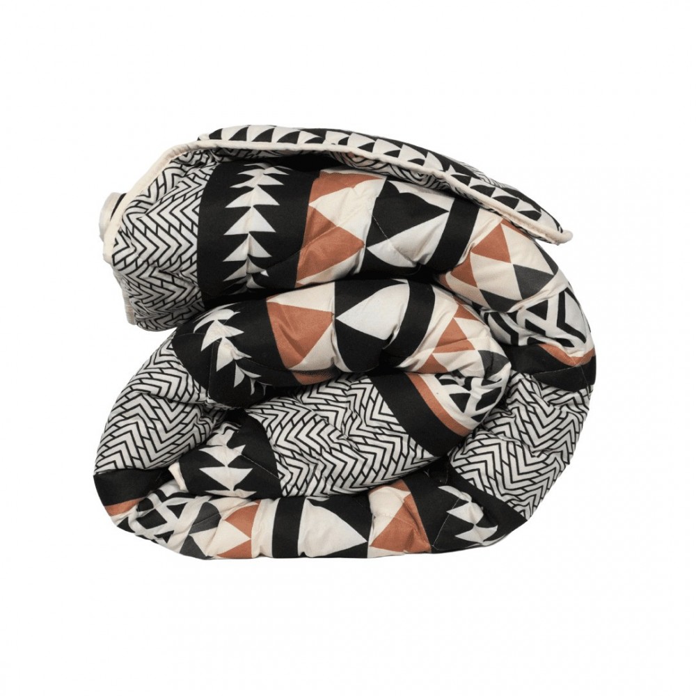 Лицевият плат от 100% микрофибър е изключително мек и приятен на допир, но същевременно е здрав и лесен за поддръжка. Дизайнът в етно абстрактен стил, съчетаващ цветове екрю, кафяво и черно, придава елегантност и модерен вид на завивката, като я прави подходяща за всяка съвременна спалня.