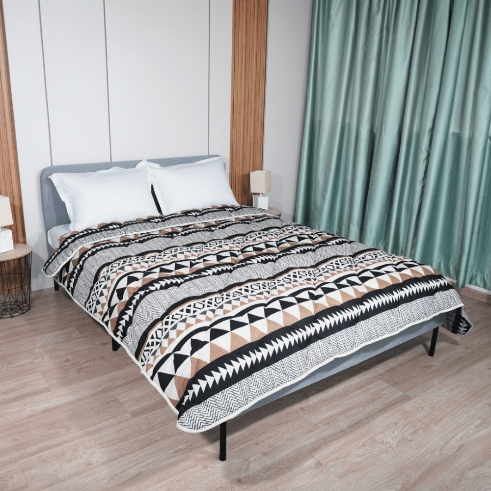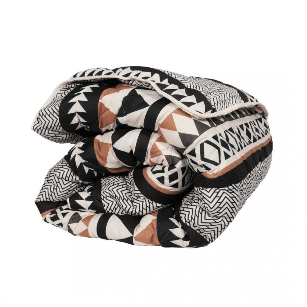 Лицевият плат на завивката е изработен от 100% микрофибър, който е изключително мек и нежен към кожата, същевременно здрав и лесен за поддръжка. Дизайнът с етно абстракни елементи в цветове екрю, кафяво и черно придава елегантност и съвременен вид на завивката, което я прави подходяща за всяка съвременна спалня.