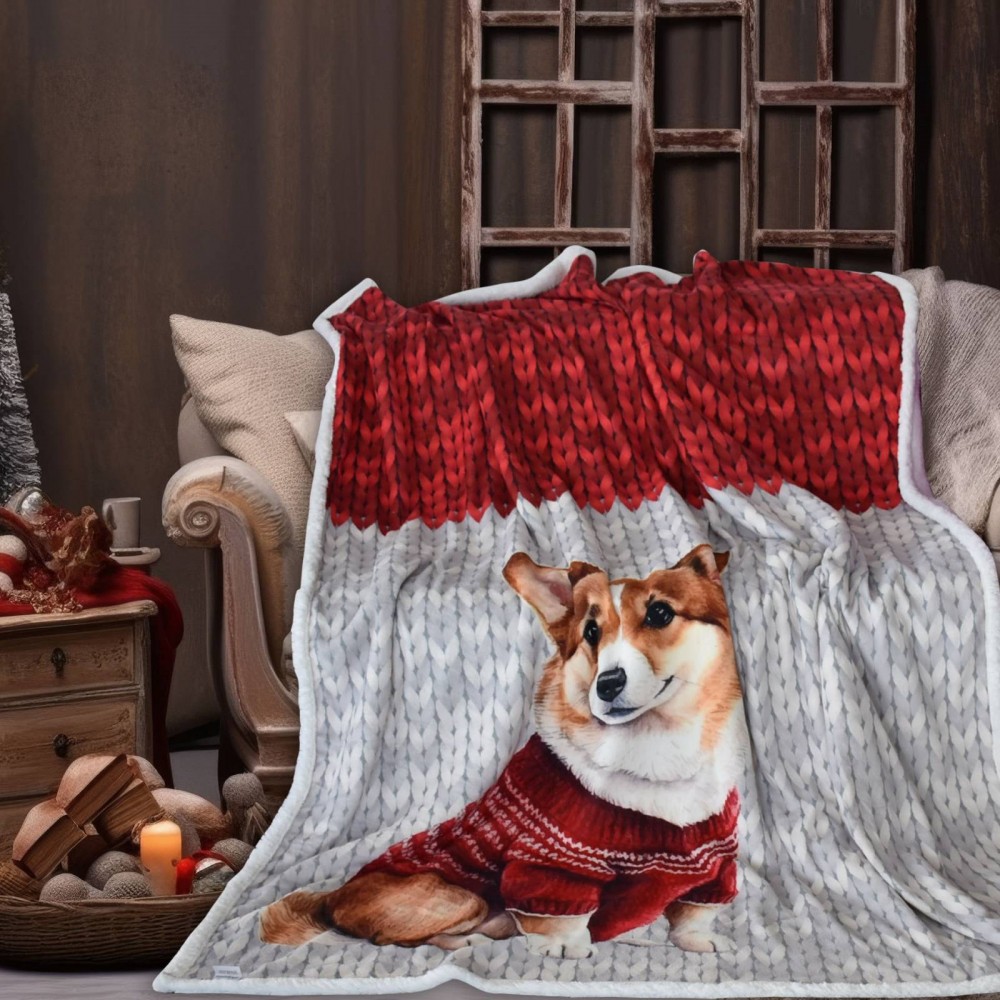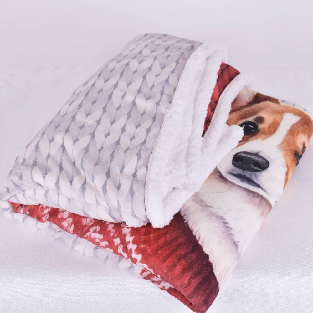 Коледното одеяло шерпа с дизайн куче с коледна дрешка на фон бяла и червена плетка ще зарадва всяко семейство със своето сладко и весело изображение. С размер 150/200 см, това одеяло ще обвие вашето тяло в мекота и топлина. Със симпатичното куче в коледна дрешка и фонът с коледна декорация, одеялото създава перфектна празнична атмосфера в дома. Изработено от 100% полиестер, одеялото е изключително удобно и лесно за поддръжка. Подходящ избор за коледен подарък.