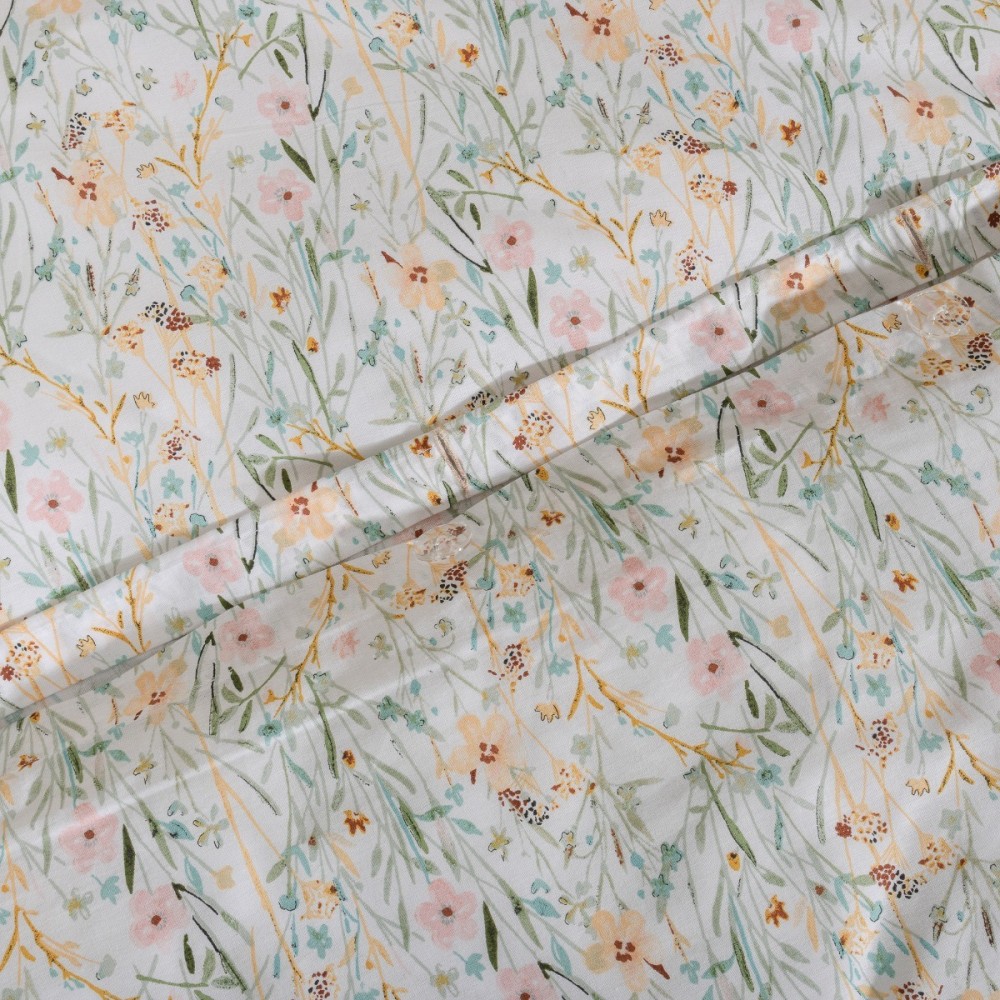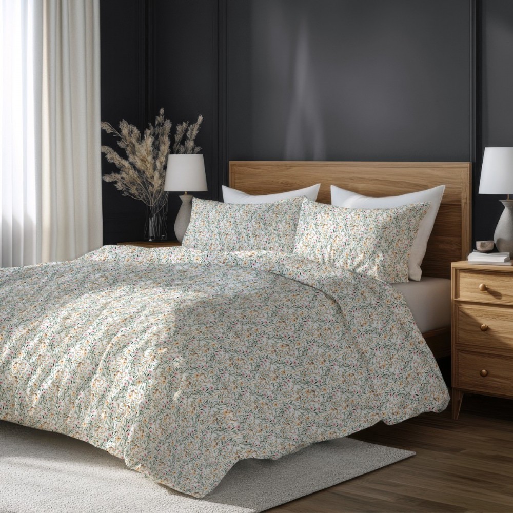 Спалният комплект Фиори пренася свежестта на цветна градина в интериора чрез своя изящен романтичен стил. Десенът е наситен с фини флорални мотиви в нежно розово, слънчево жълто и свежо зелено върху светла основа, които внасят усещане за ефирност и естествена хармония. Този модел е изключително подходящ избор за момичета и жени, търсещи уютна и гостоприемна атмосфера в спалнята.