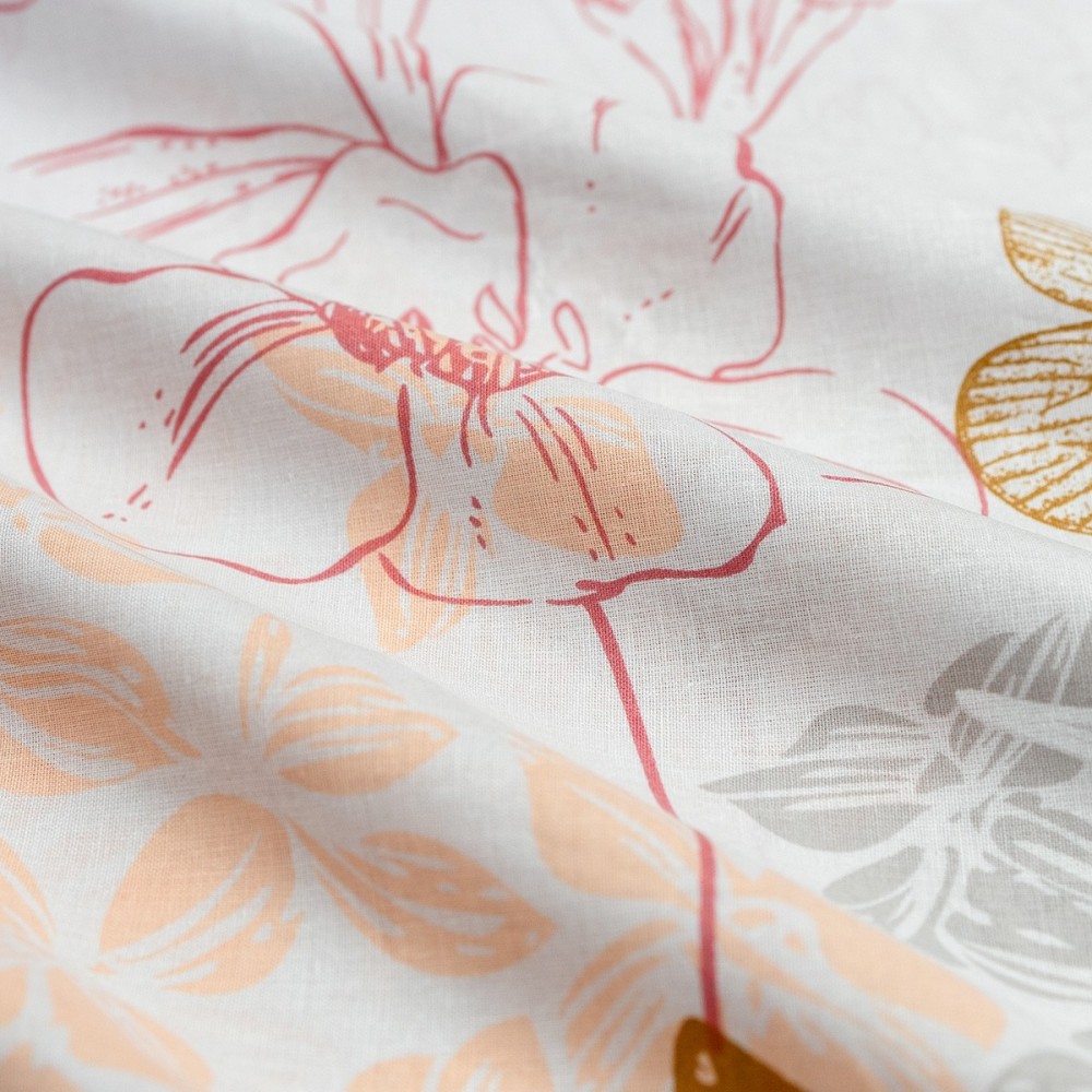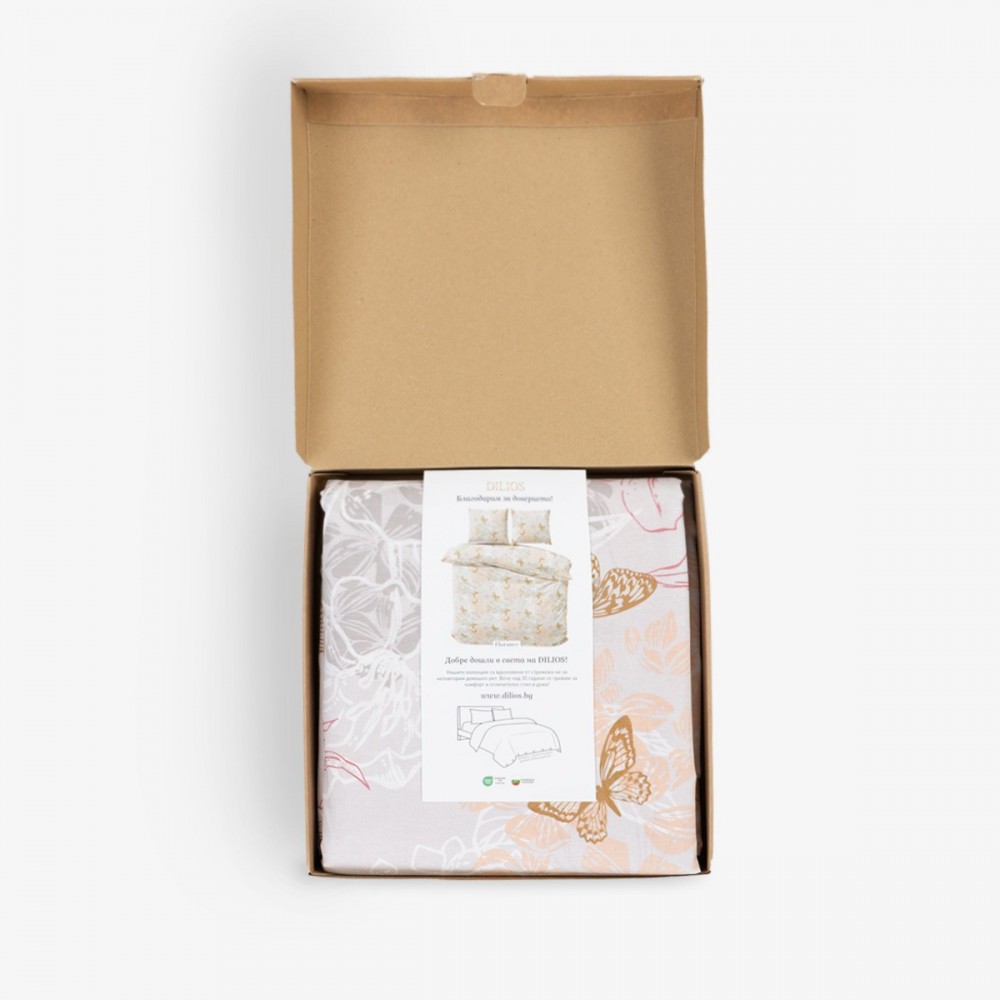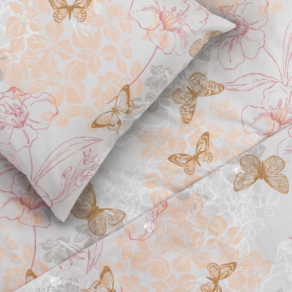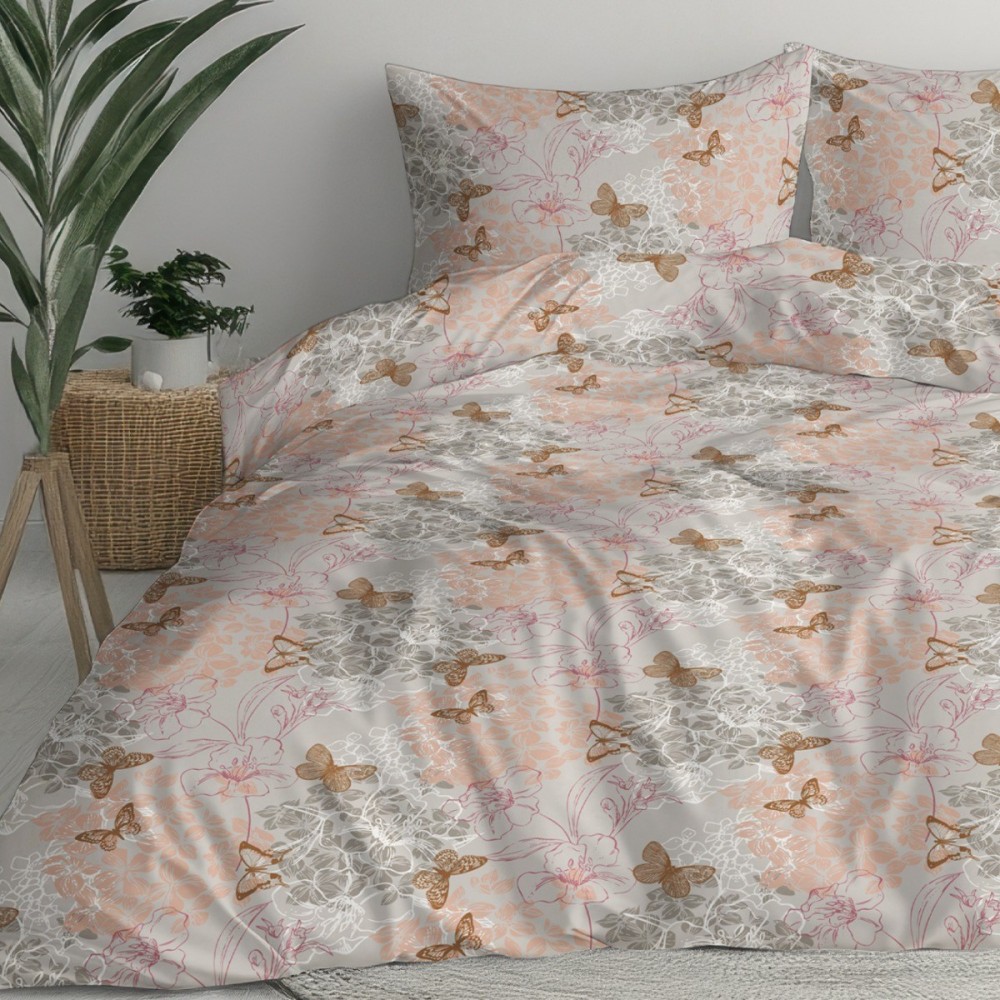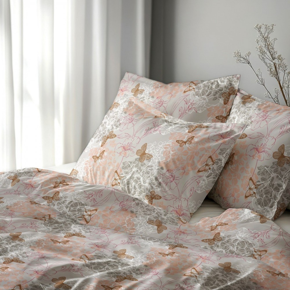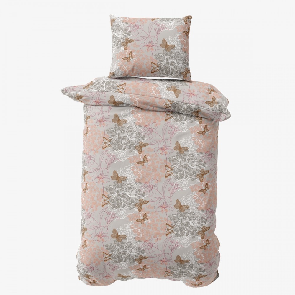 Спалният комплект Флоранс въплъщава изтънчен романтичен стил, решен в ефирна палитра от пудрено розово, нежна охра и приглушено сиво. Десенът съчетава деликатни флорални мотиви с ефирни изображения на пеперуди, които внасят усещане за лекота и пролетна свежест в интериора. Този дизайн за единично легло е изключително подходящ избор за момичета и тийнейджъри, търсещи спокойна и гостоприемна атмосфера в своята стая.