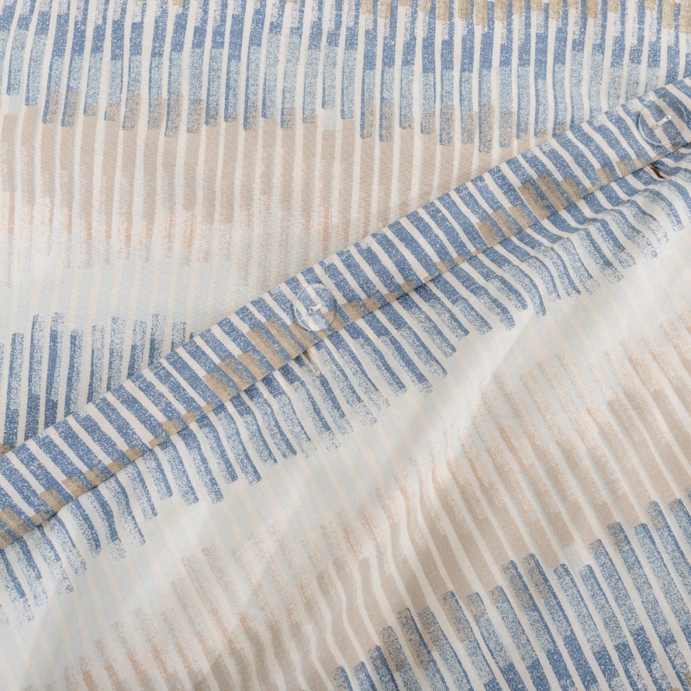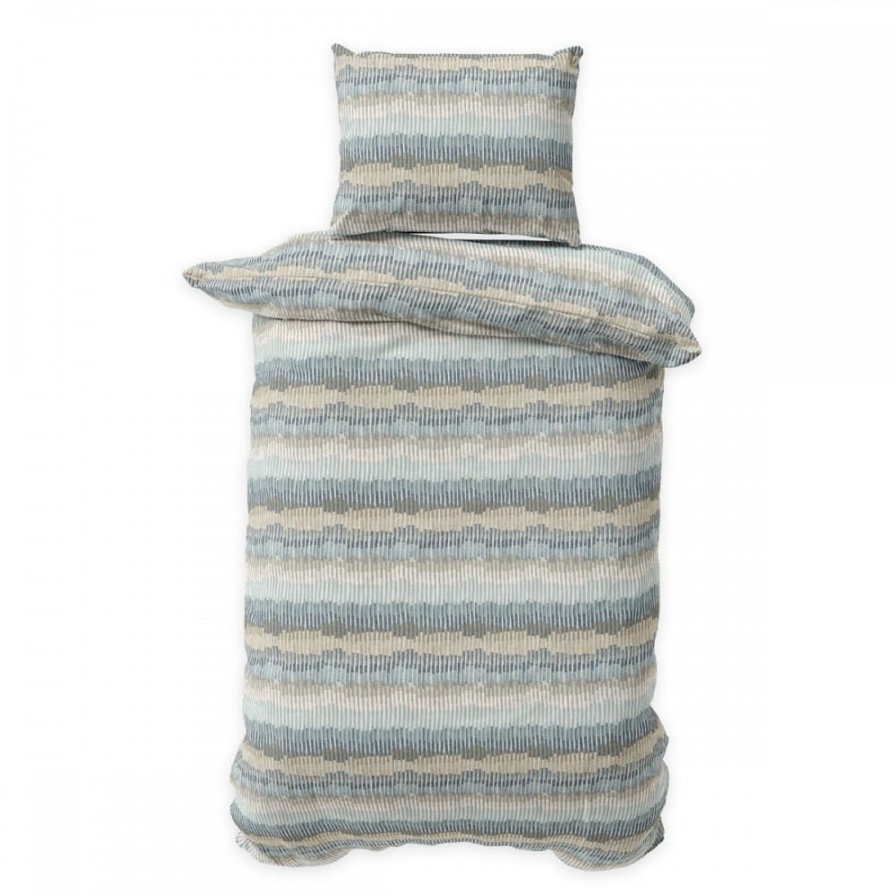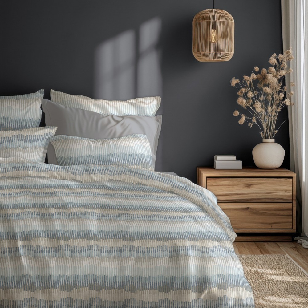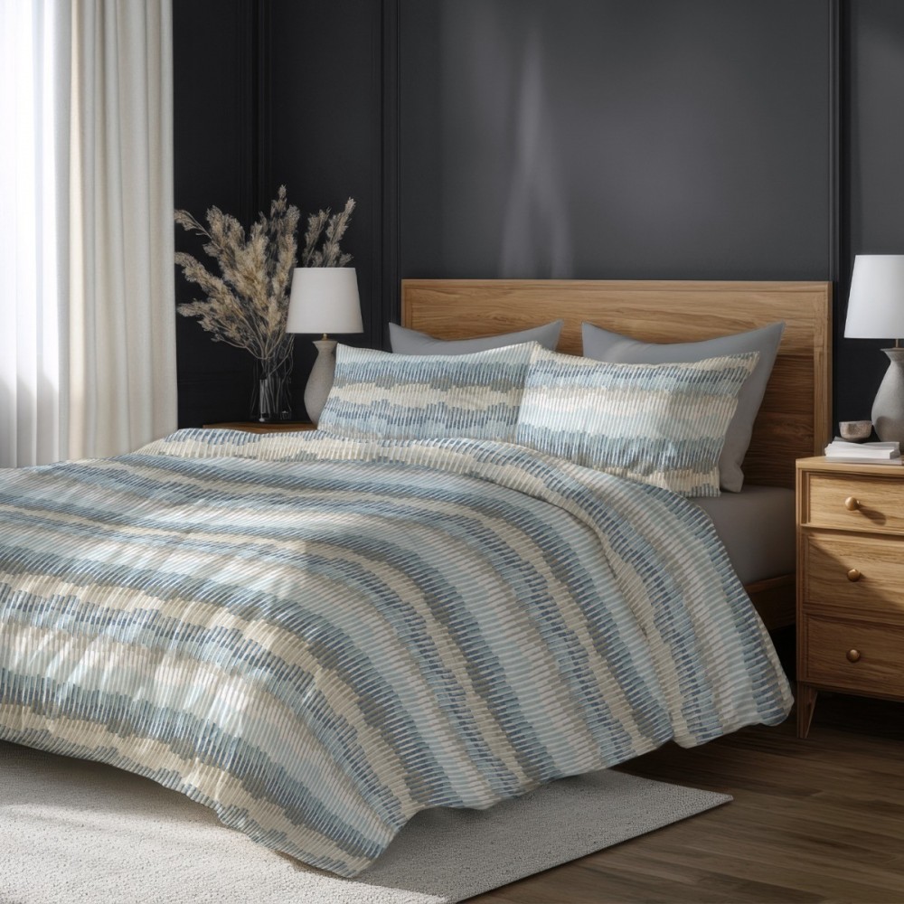 Спалният комплект Калейдос залага на модерен абстрактен дизайн, изпълнен в хармонична палитра от морско синьо, графитено сиво и пясъчни тонове. Ритмичните вертикални щрихи внасят съвременна естетика и усещане за текстура в интериора. Този комплект за единично легло е практично решение както за самостоятелно легло, така и за двойна спалня в случаите, когато партньорите предпочитат да използват отделни завивки за по-голям индивидуален комфорт по време на сън.