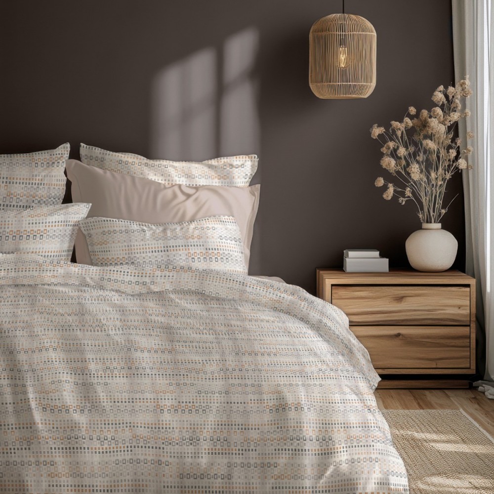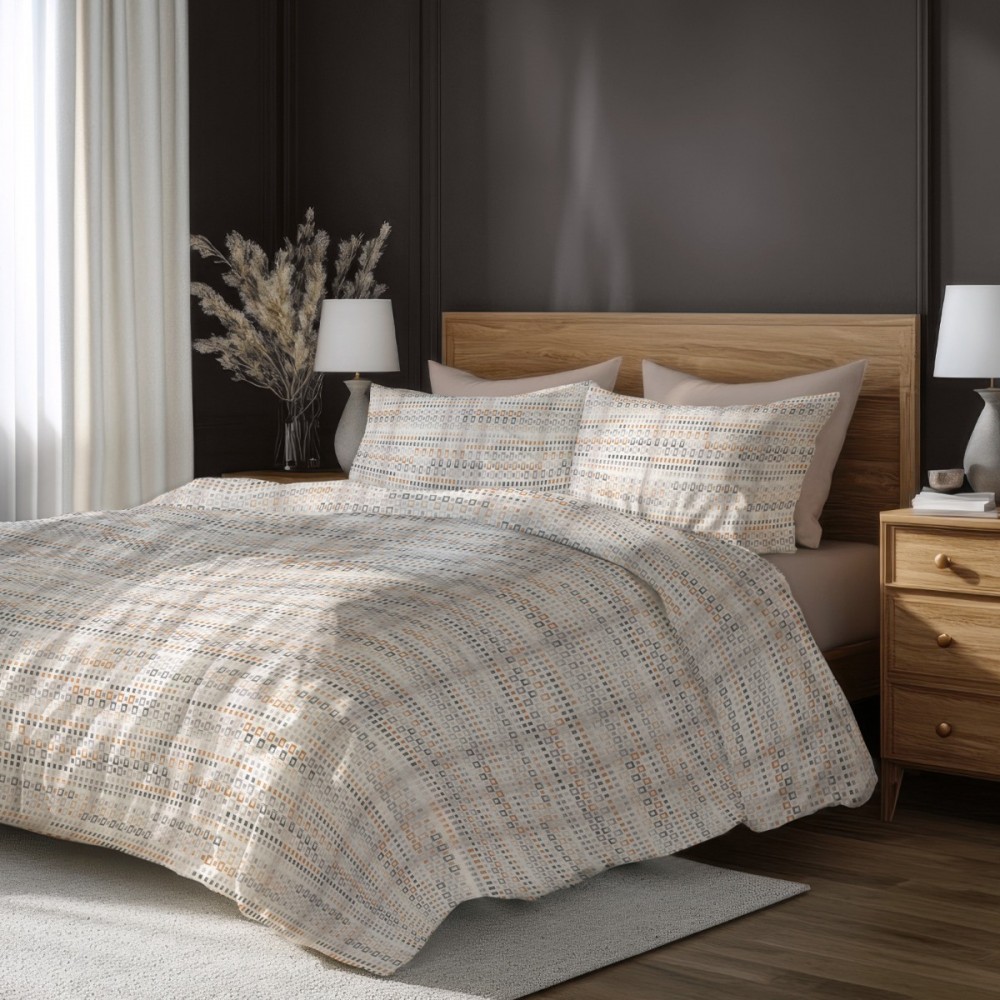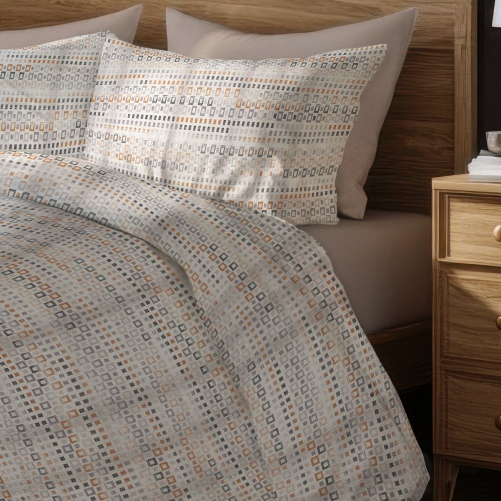 Спалният комплект Матрикс представя интригуващ графичен стил, вдъхновен от дигиталната естетика и модерния минимализъм. Десенът е изграден от ритмични структури от малки квадратни елементи в преливащи се нюанси на сиво, охра и приглушена теракота върху светла основа. Това съвременно спално бельо е идеално решение за интериори, които залагат на визуална динамика и прецизна подредба на формите, като е еднакво подходящ избор за мъже и жени.