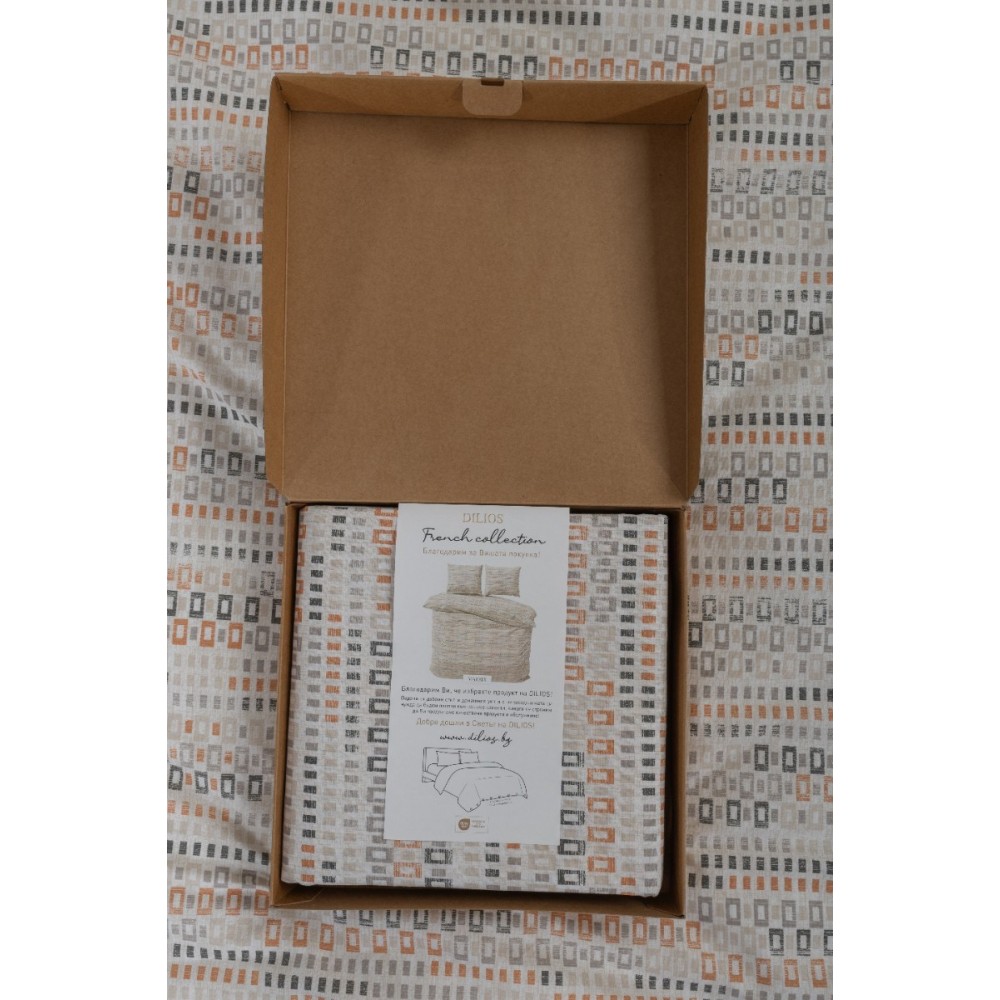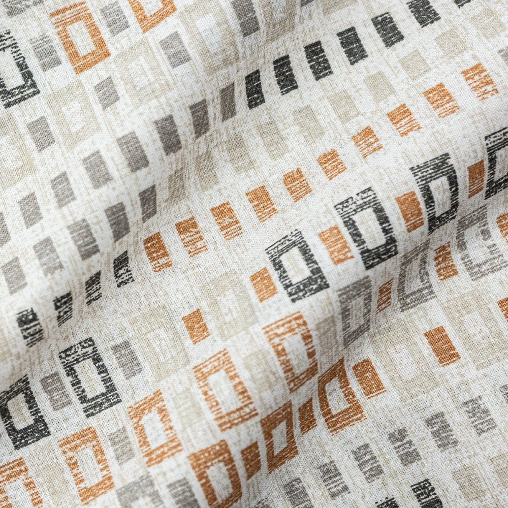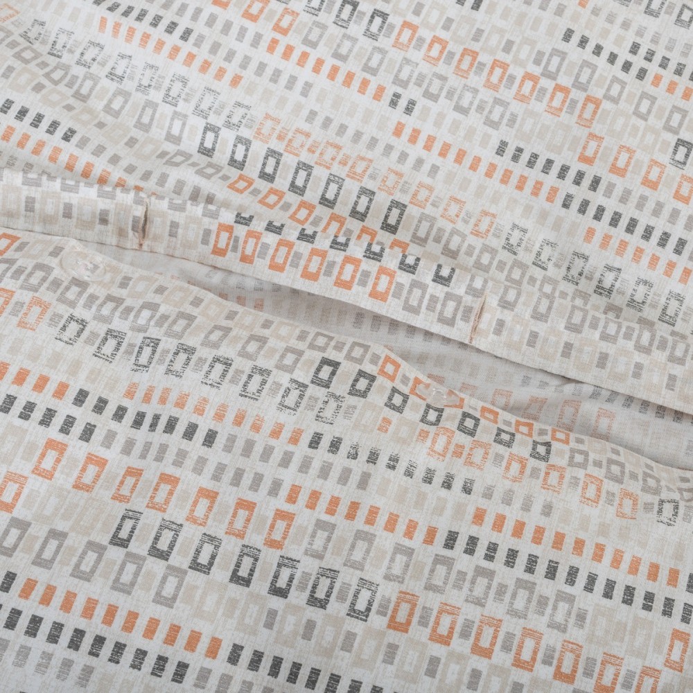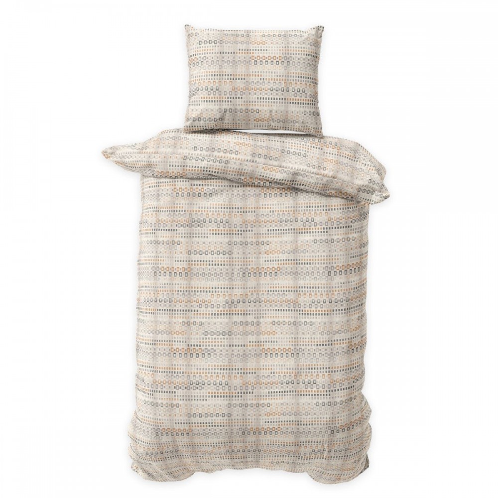 Спалният комплект Матрикс представя интригуващ графичен стил, вдъхновен от дигиталната естетика и модерния минимализъм. Десенът е изграден от ритмични структури от малки квадратни елементи в преливащи се нюанси на сиво, охра и приглушена теракота върху светла основа. Това съвременно спално бельо е идеално решение за интериори, които залагат на визуална динамика и прецизна подредба на формите, като е еднакво подходящ избор за мъже и жени.