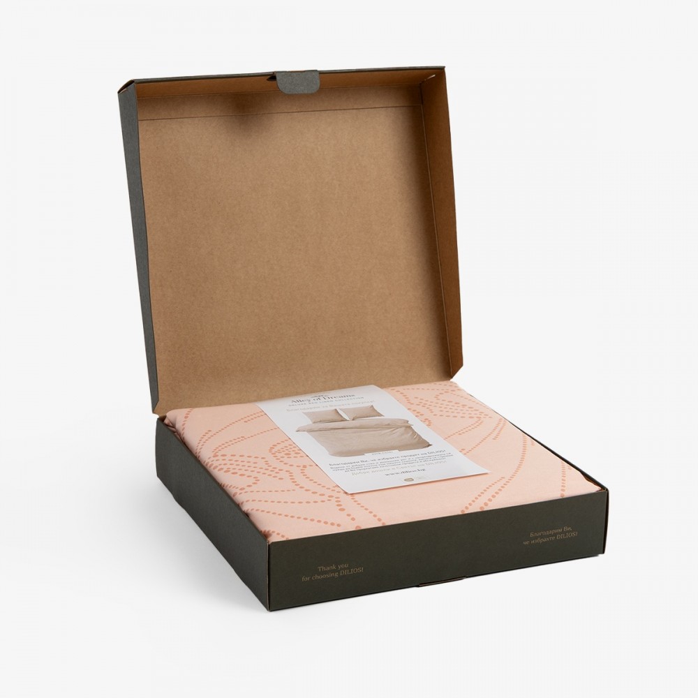Технологията на реактивно багрене Soft pigment print гарантира, че цветовете ще останат наситени и дълбоки, запазвайки деликатния допир на памука години наред. Тъй като окомплектовката от две части е без долен чаршаф, тя дава пълна свобода за комбиниране с чаршаф с ластик или стандартен такъв в бяло, сиво или контрастен нюанс според личните предпочитания. Изтънчената визия е подчертана от луксозната кутия, превръщаща комплекта в престижен подарък за специални поводи или за ценители на висококачествения текстил.