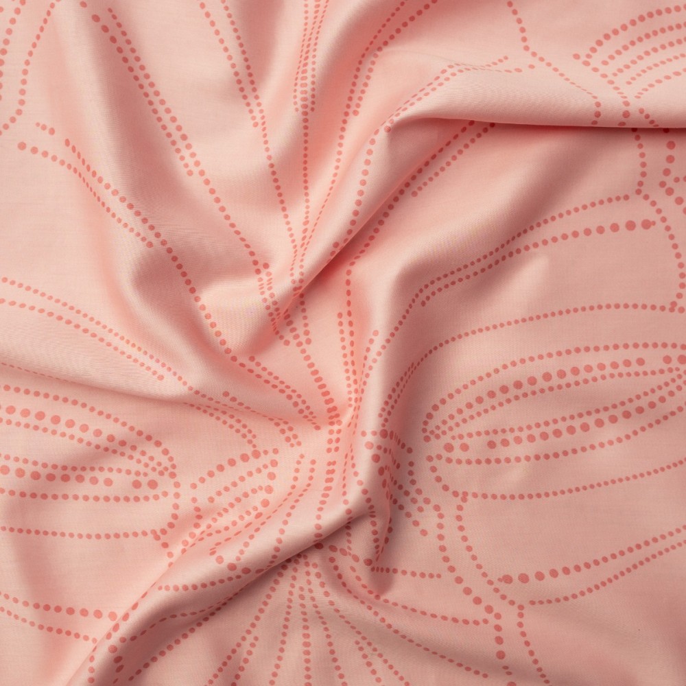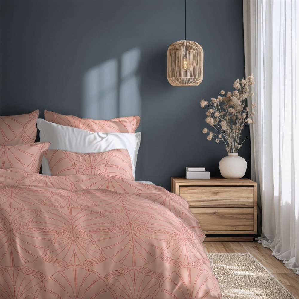 Спалният комплект Розов пясък пренася ефирната естетика на крайбрежието в интериора чрез своя модерен маринистичен дизайн. Десенът интерпретира органичните форми на морски миди и ветрила, пресъздадени чрез фини графични линии върху успокояващ пудрен фон в нюанс пепел от рози. Този дизайн в размер за единично легло е изключително подходящ за момичета и жени, търсещи съчетание от нежност и съвременен стил, като същевременно е практично решение за двойна спалня, в която се предпочитат отделни завивки.