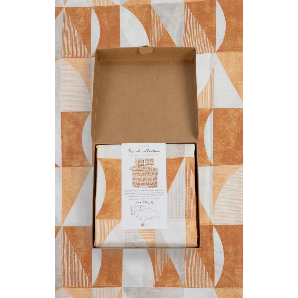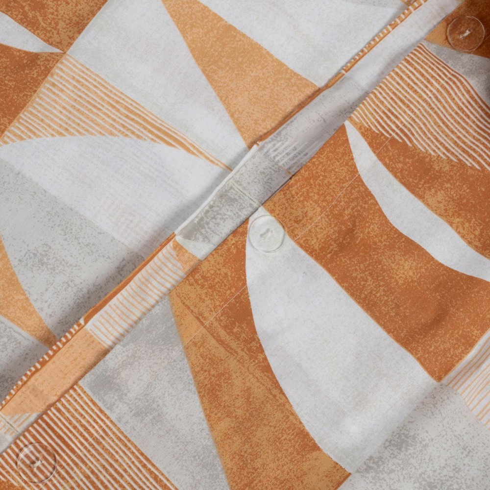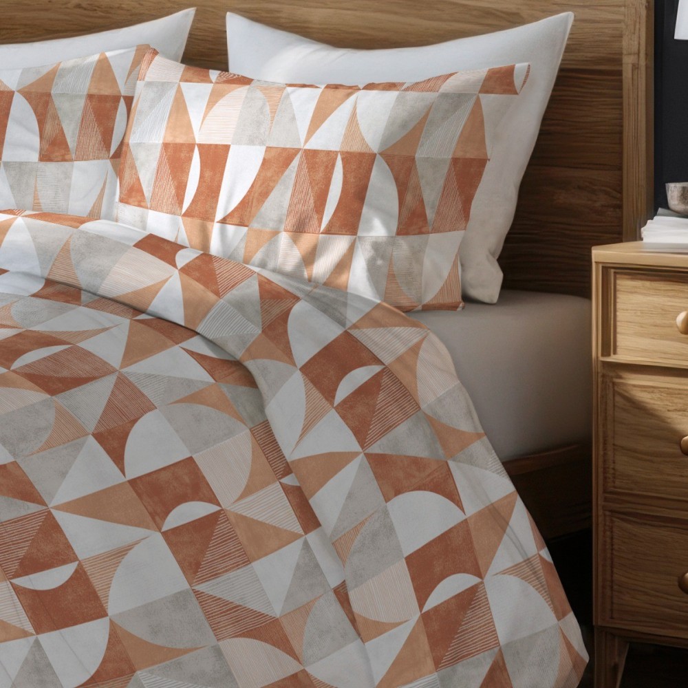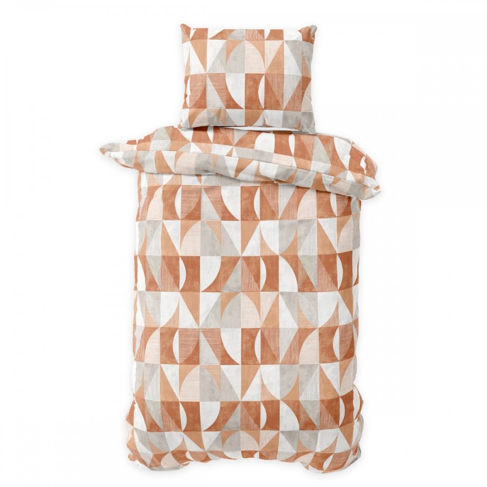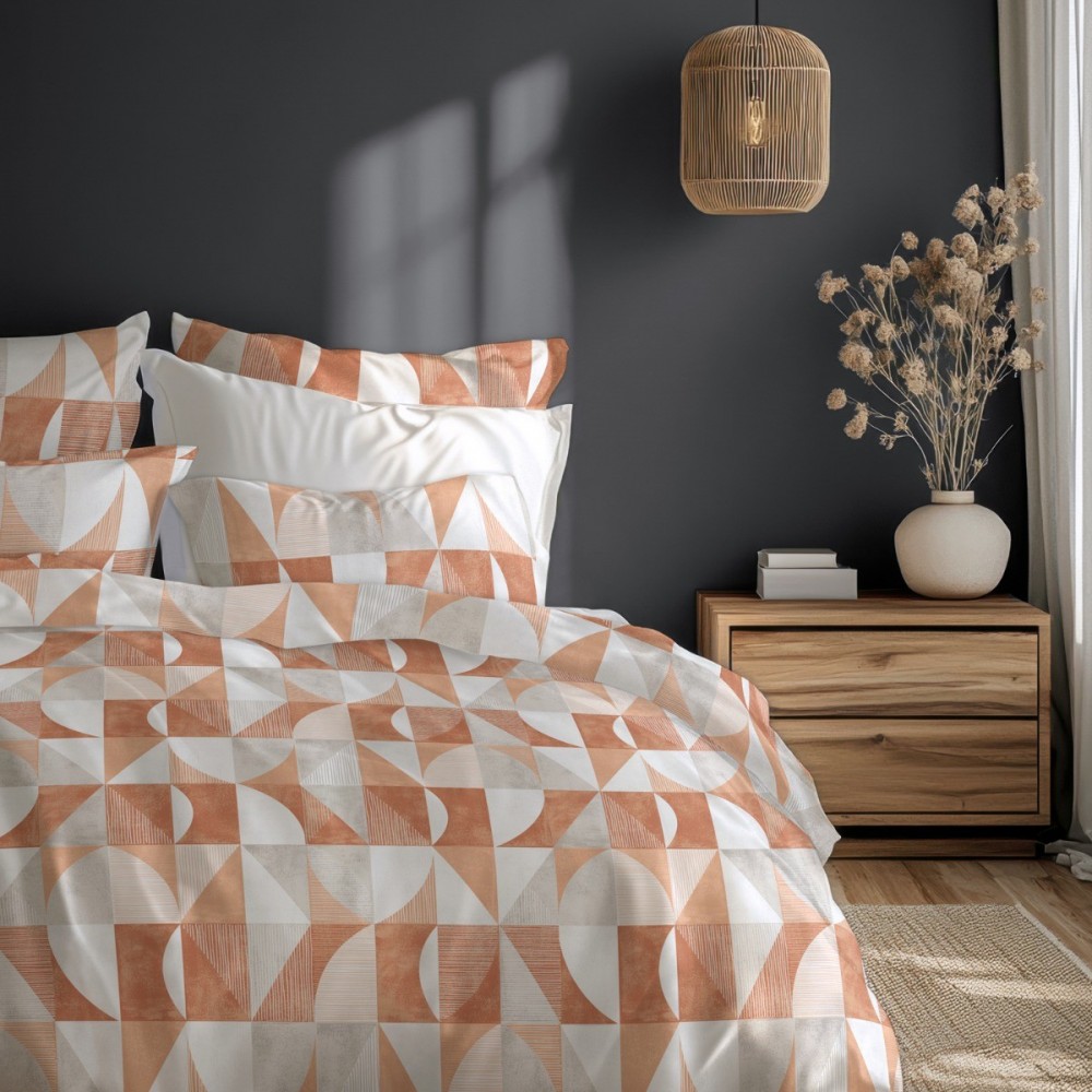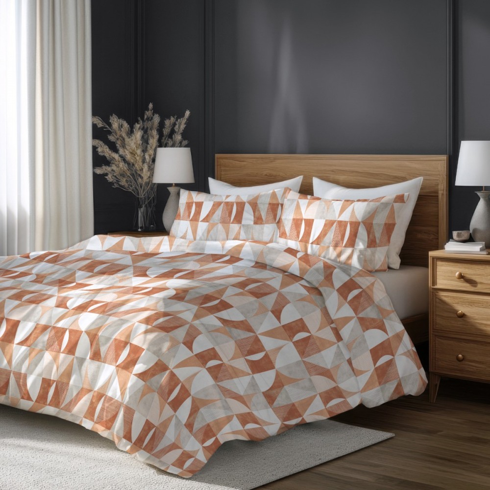 Спалният комплект Танграм представя модерен геометричен стил, вдъхновен от минималистичната естетика и топлите земни нюанси. Дизайнът залага на динамична композиция от триъгълни и полукръгли форми в преливащи се тонове на теракота, охра и меко сиво. Този визуален акцент внася съвременна енергия и подреденост в интериора, като е еднакво подходящ избор за мъже и жени, които ценят графичните детайли.