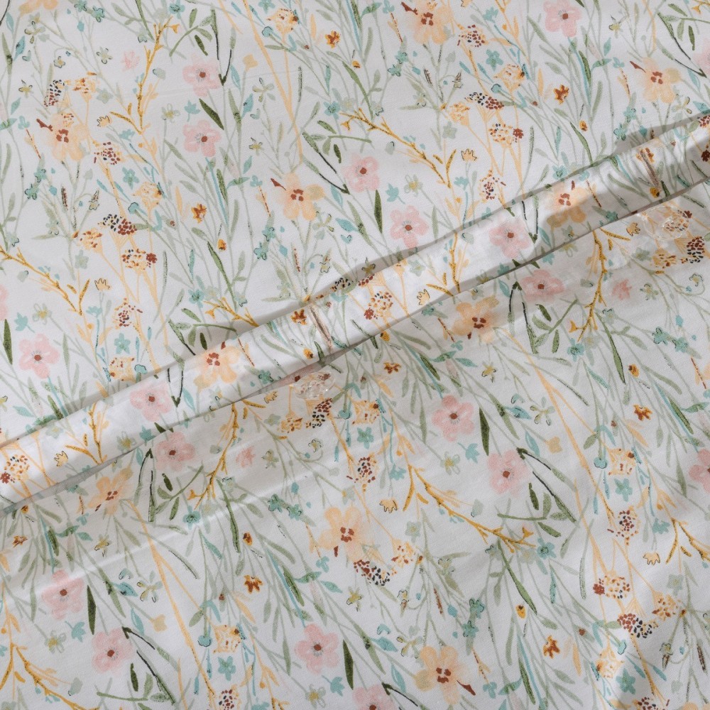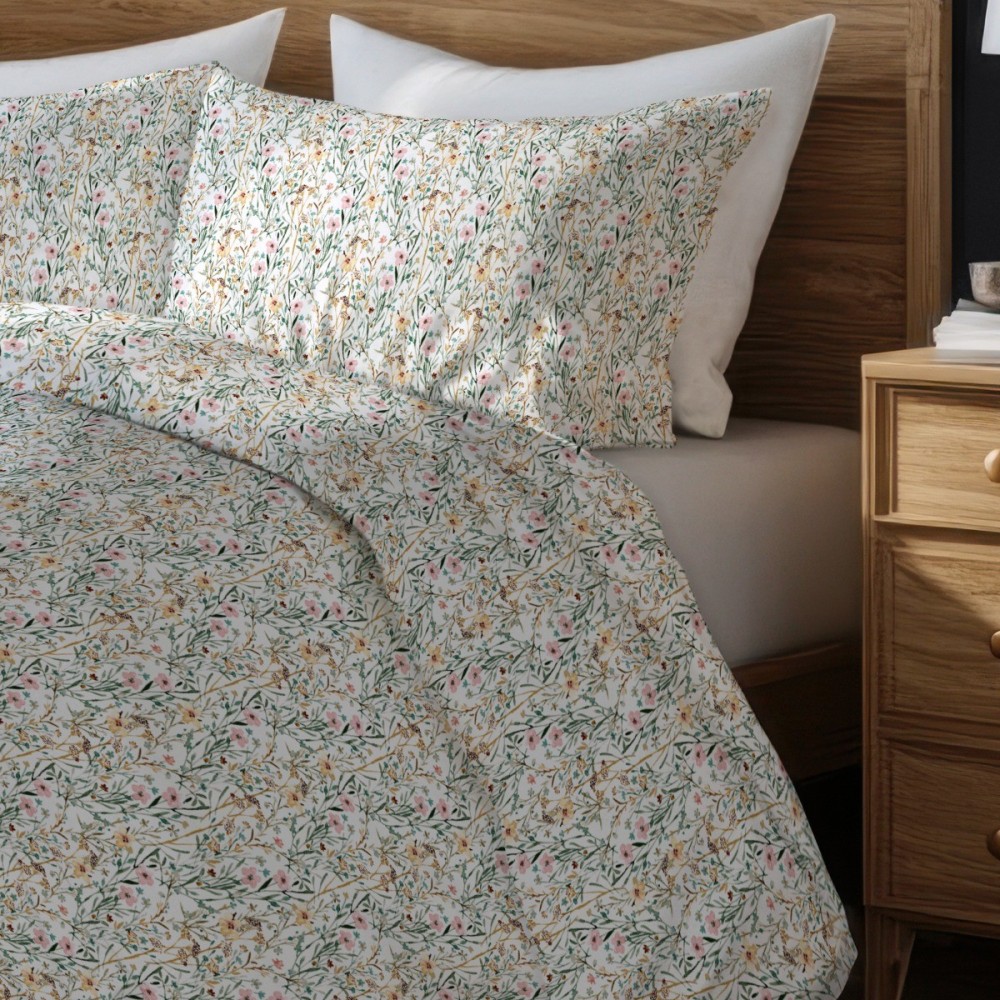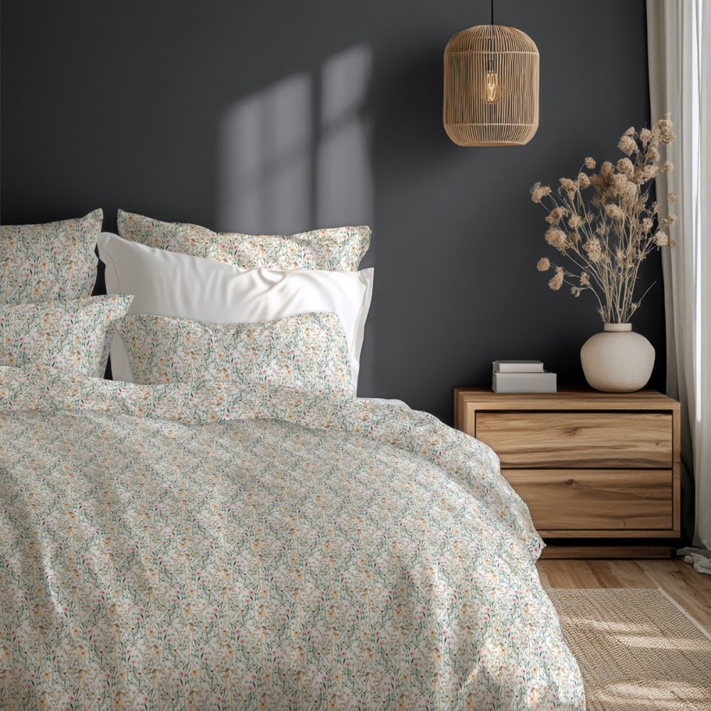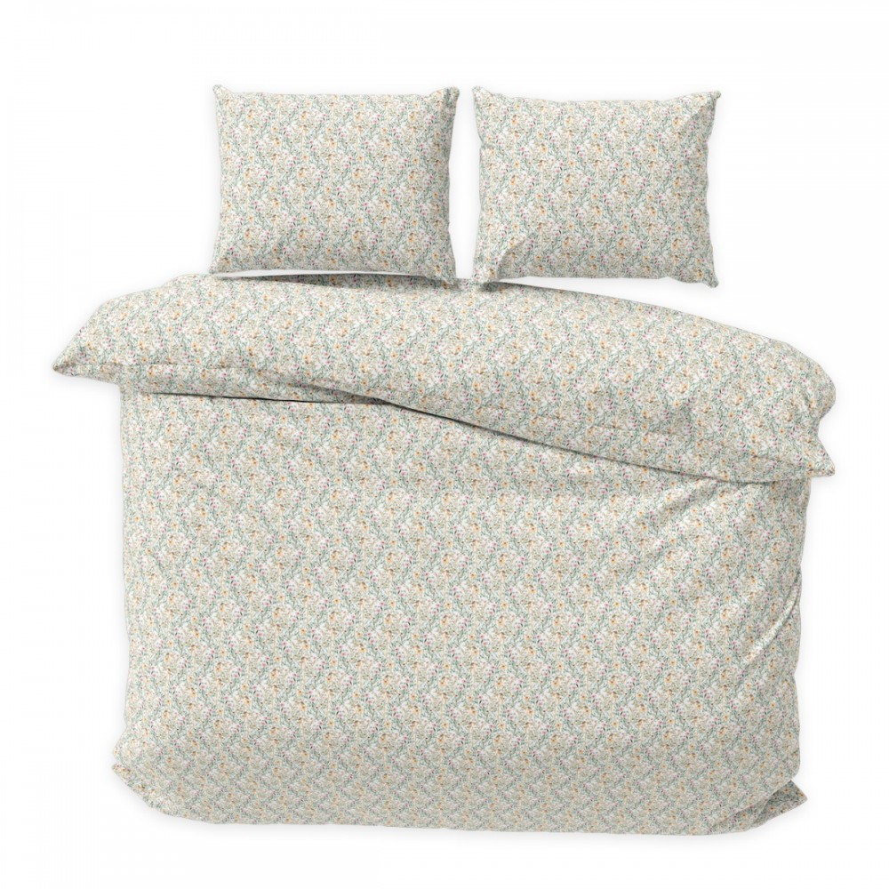 Спалният комплект Фиори представя изящен романтичен стил, вдъхновен от дивата природа и пролетната свежест. Десенът е наситен с деликатни флорални мотиви в нежно розово и слънчево жълто върху бяла основа, които внасят усещане за ефирност и естествена хармония в интериора. Това висококачествено спално бельо е перфектният избор за тези, които търсят уютна и гостоприемна атмосфера в спалнята.