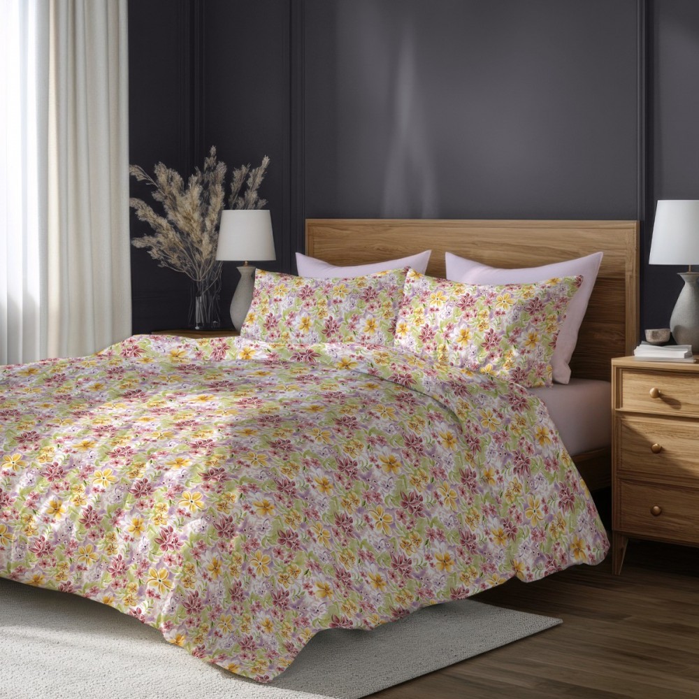 Спалният комплект Верано пренася жизнената енергия на лятната градина директно във вашата спалня. Десенът е издържан в ефирен романтичен стил, изпълнен с пъстри флорални мотиви в нюанси на лилаво, слънчево жълто и свежо зелено. Това цветно спално бельо е перфектен избор за тези, които се стремят към позитивна атмосфера и визуално богатство в интериора.