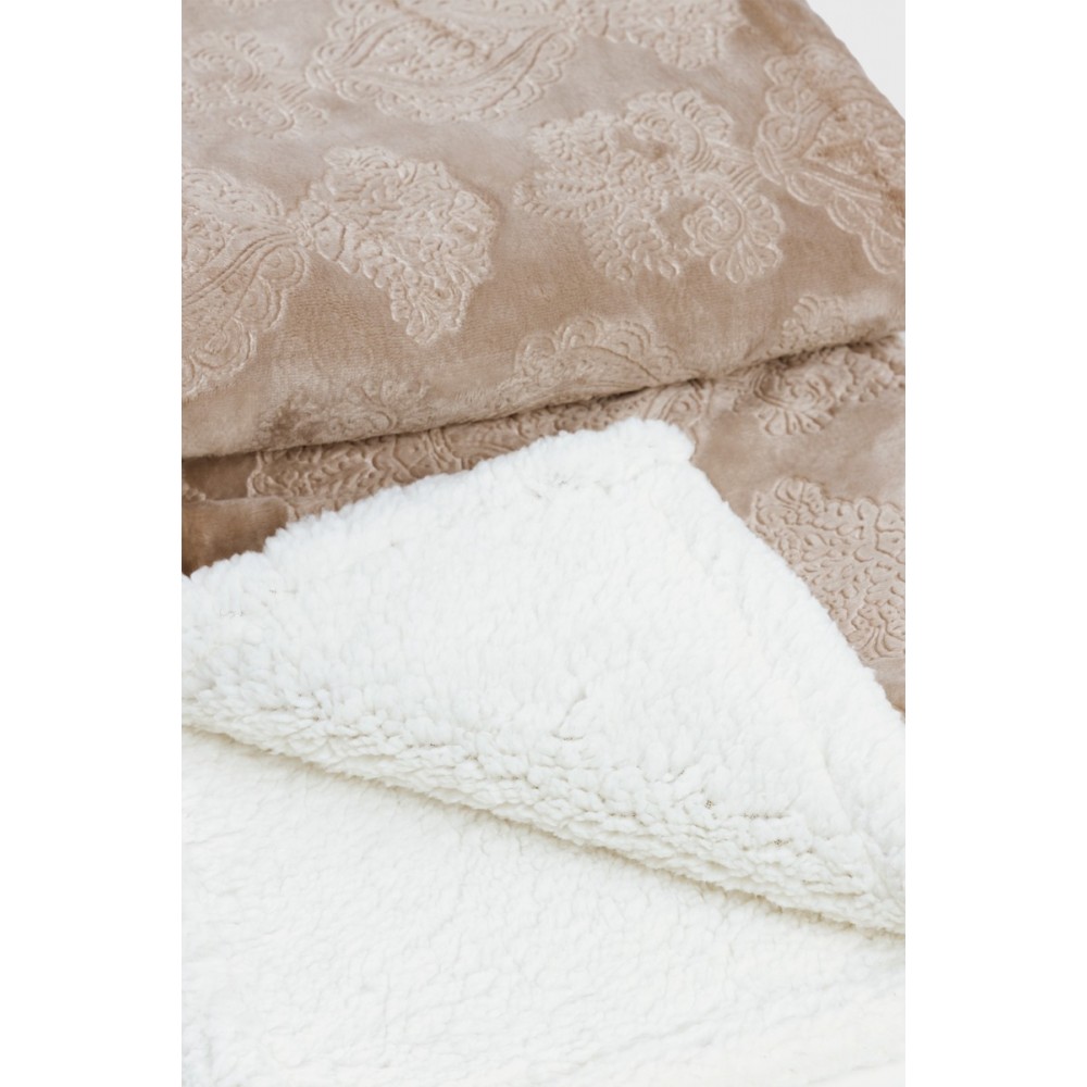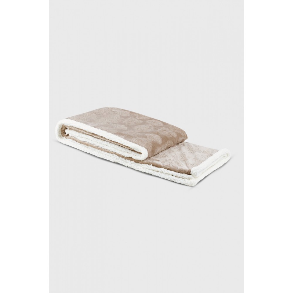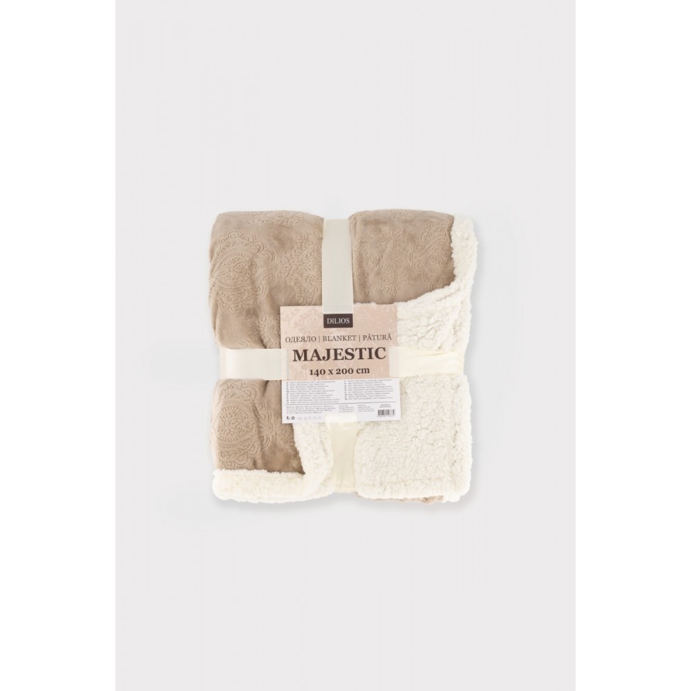 Одеялото е част от серията "Маджестик" и е изработено в стил шерпа - лицева страна в цвят таупе с деликатен фигурален мотив и вътрешна страна тип шерпа, която осигурява отлична топлоизолация и усещане за пухкав комфорт.