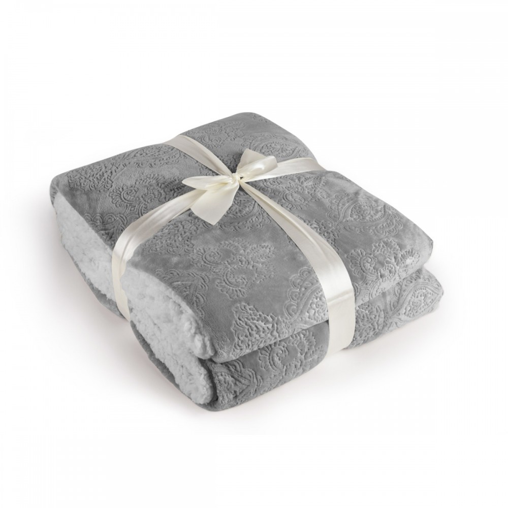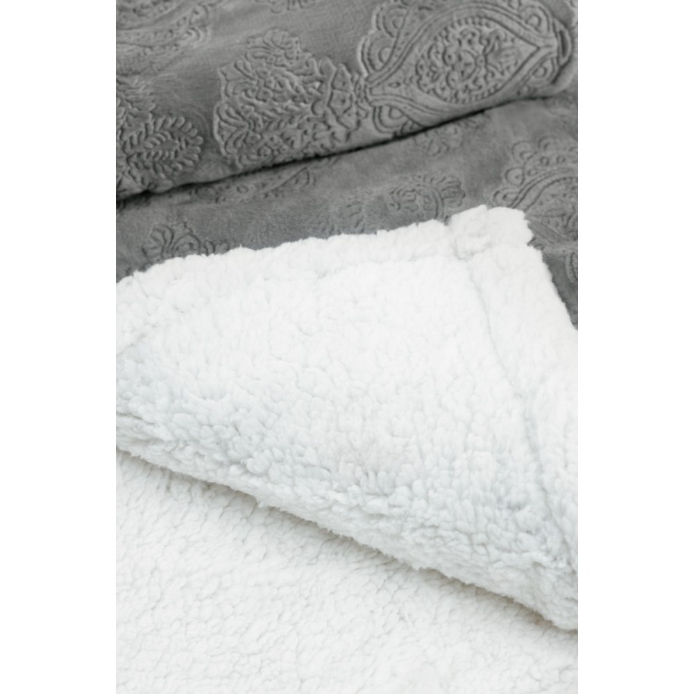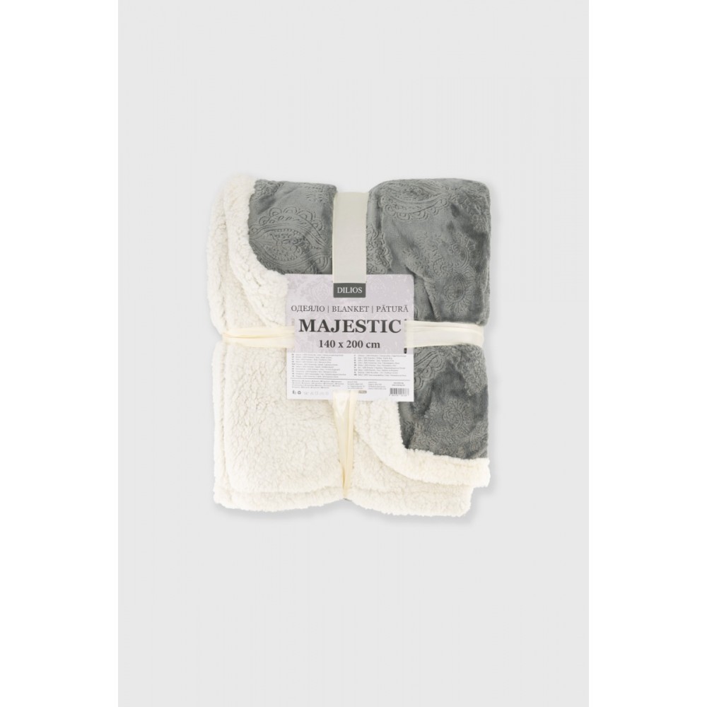 Одеялото е част от серията "Маджестик" и е изработено в стил шерпа - сива лицева страна с деликатен фигурален мотив и вътрешна страна тип шерпа, която осигурява отлична топлоизолация и усещане за пухкав комфорт.