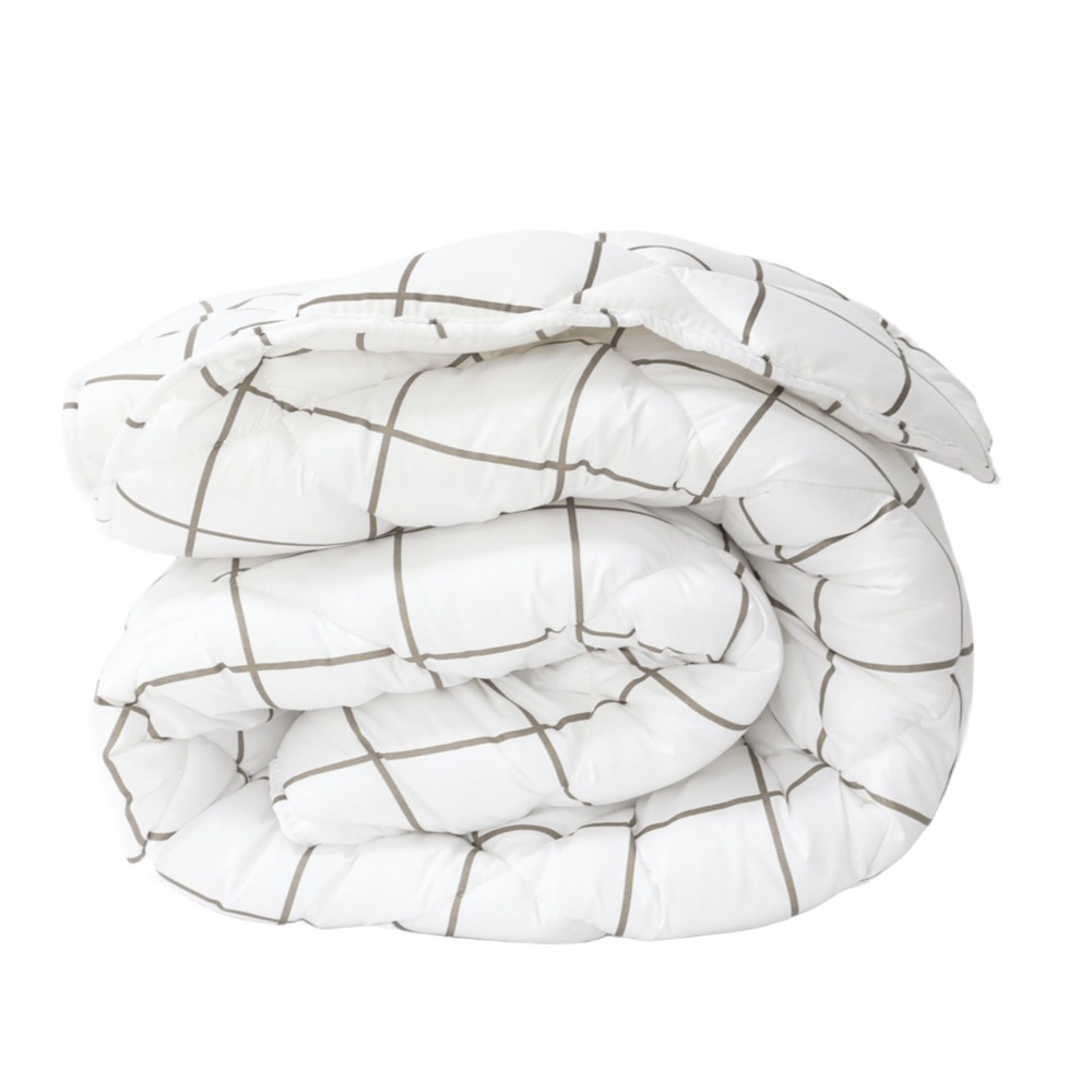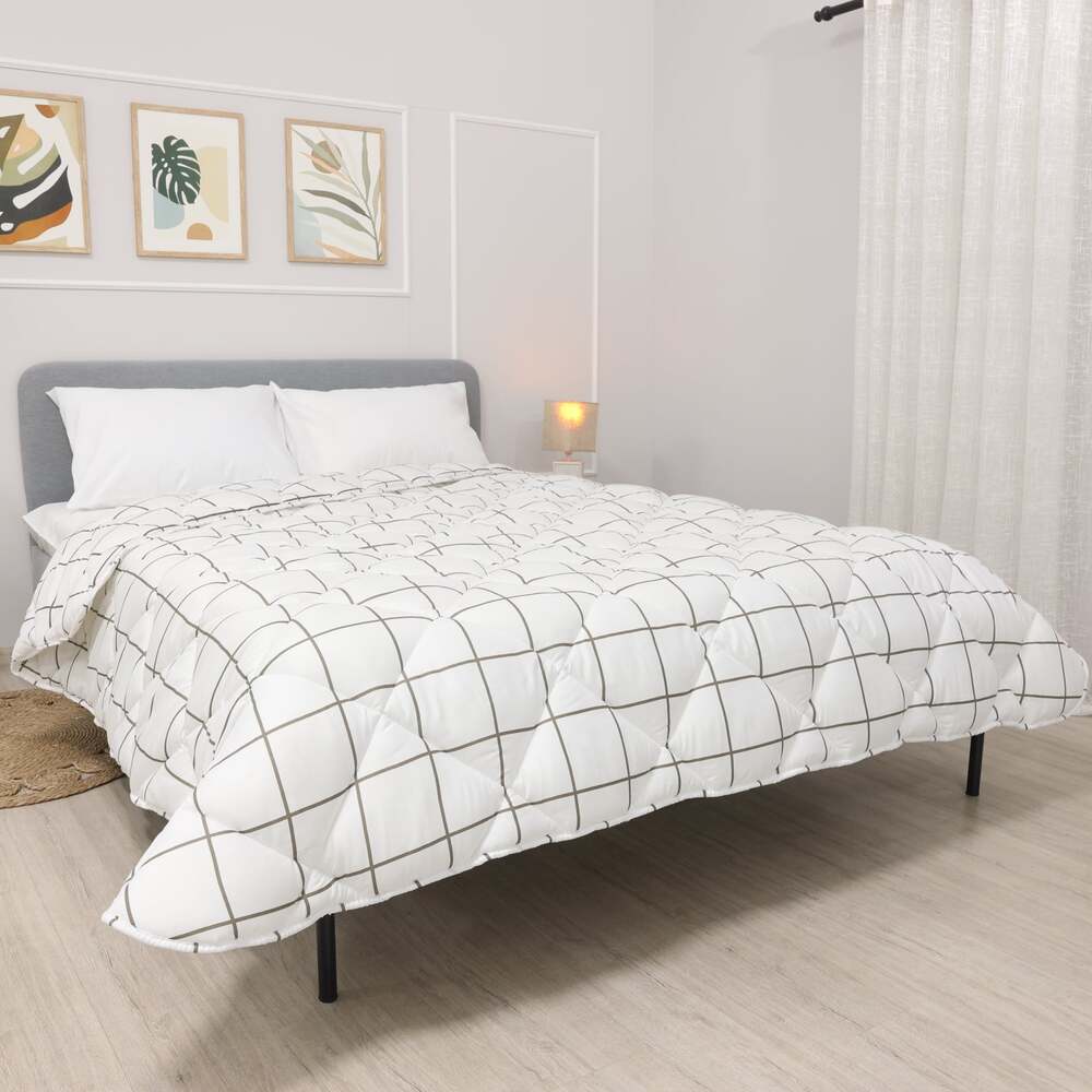 Зимната олекотена завивка „Хюга Челси“ носи скандинавския уют и елегантност, вдъхновена от концепцията Hygge. Със своето бежово решетъчно райе върху фон в светло екрю, тя придава минималистична елегантност и спокойствие във всяка спалня, създавайки топла и уютна атмосфера за зимните нощи.