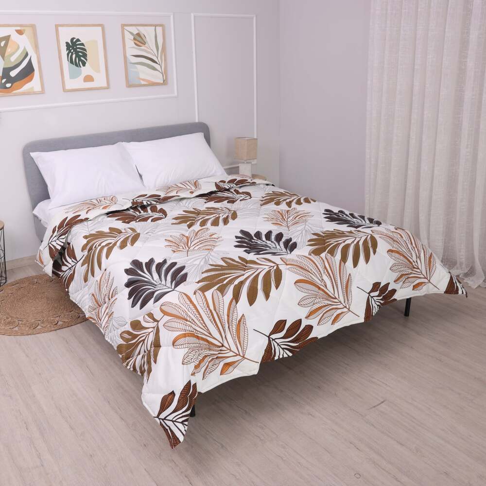 Зимната олекотена завивка „Мирабел Елис“ за спалня добавя изтънченост и топлина към вашето двойно легло с нежния си флорален мотив в бежово-кафявата гама, разположен върху светъл фон. Съчетанието на тези елегантни цветове придава уют и свежест, създавайки спокойна и хармонична атмосфера в спалнята.